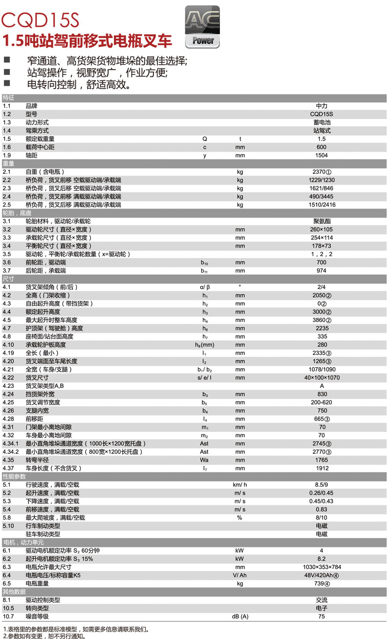 1.5噸前移式站駕電動(dòng)叉車(chē)CQD15S