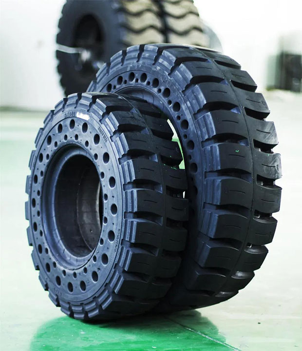 實(shí)心輪胎的生產(chǎn)具有半個多世紀(jì)生產(chǎn)歷史和經(jīng)驗(yàn)的先進(jìn)技術(shù),在橡膠配方設(shè)計上最大限度地提高了輪胎的使用性能,特別是基部膠全部采用國外進(jìn)口高剛性、低生熱膠料,輪胎在運(yùn)行時的生熱和溫升降到最低,同時又提高輪胎的耐熱性能,從而解決了實(shí)心輪胎因溫升導(dǎo)致的脹大、滑圈、爆裂等嚴(yán)重問題;先進(jìn)的配方設(shè)計又降低了輪胎的滾動阻力。經(jīng)國家工程機(jī)械質(zhì)量監(jiān)督檢驗(yàn)中心檢測,實(shí)心輪胎滾動阻力系數(shù)與充氣輪胎相當(dāng),這樣就解決了因換用實(shí)心輪胎帶來的油耗升高問題;